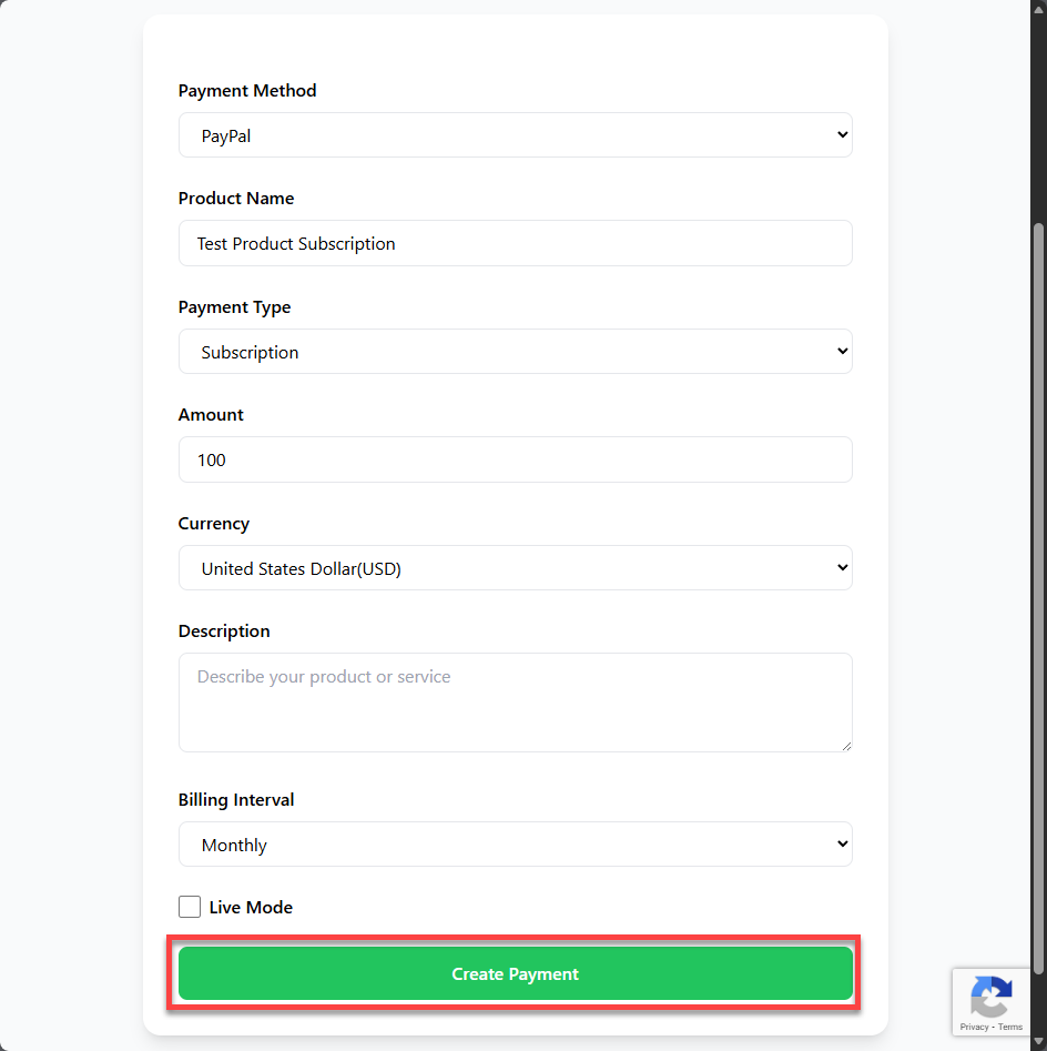 From the dashboard, click Add Product: Add Product Payment You will see the following screen: Create One-Time or Subscription Enter all required values: Enter Values Click Create Payment: Click Create Payment You’ll then see the Settings overview for adding the integration into your website: Integration Snippets