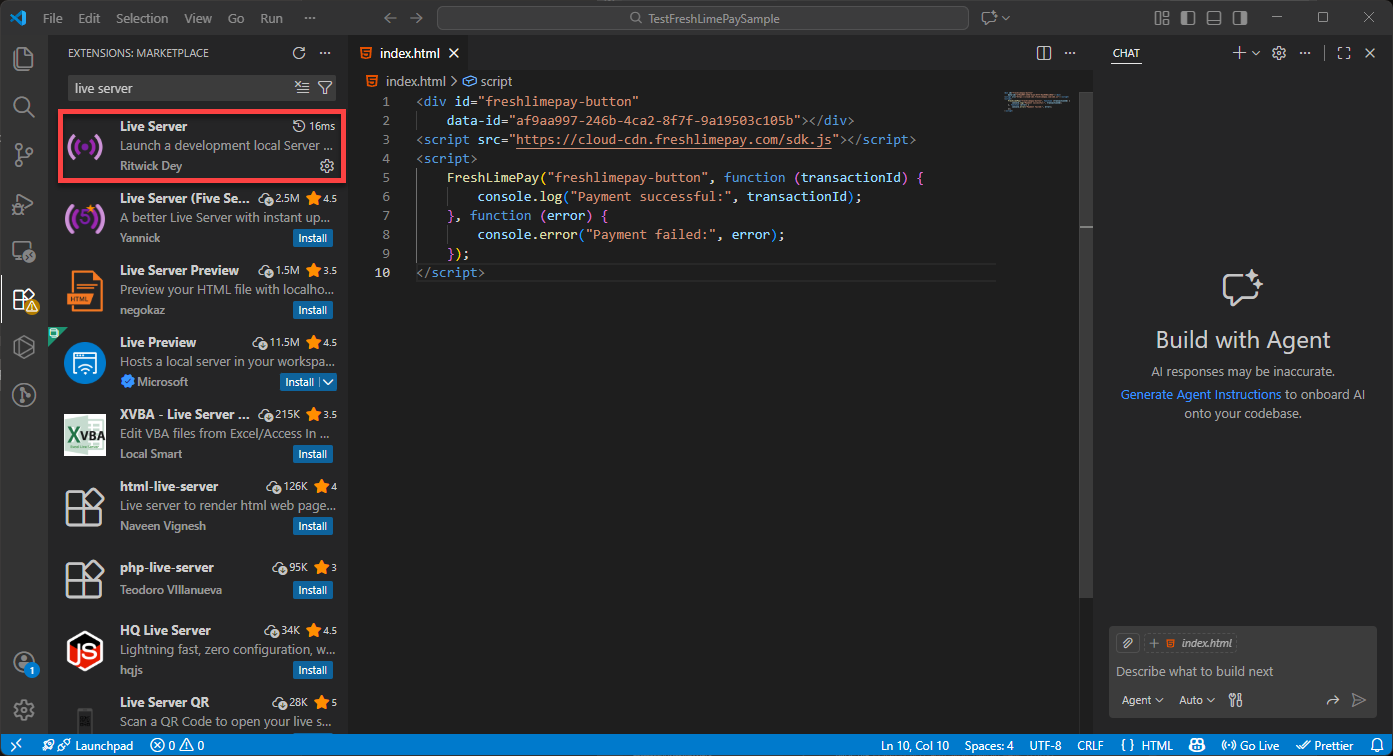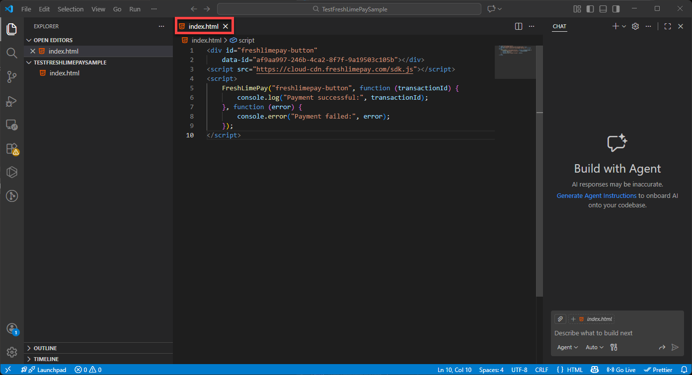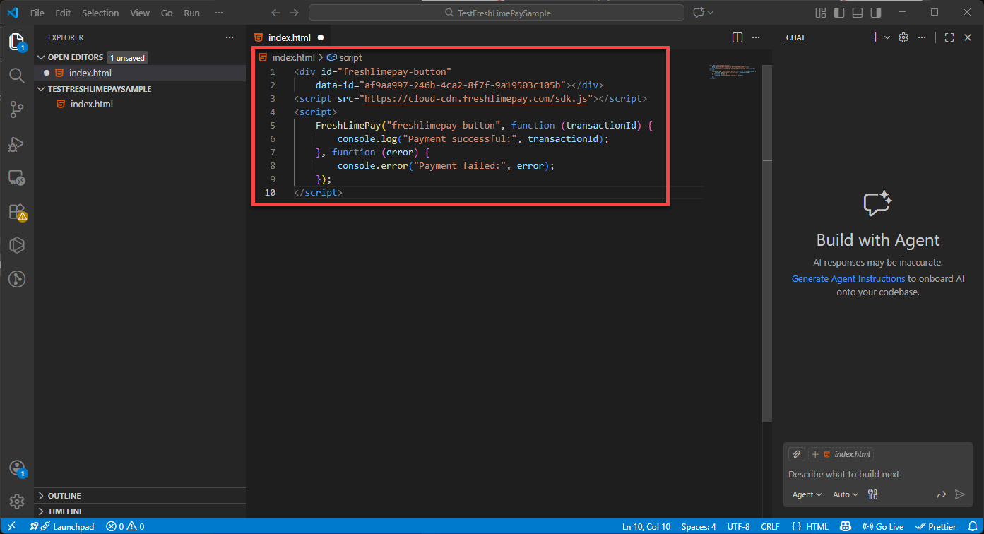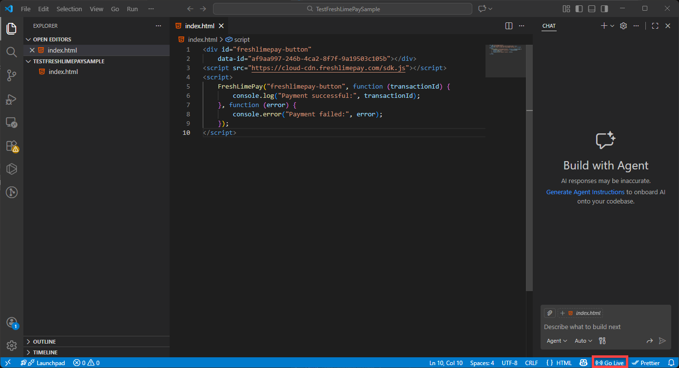 Copy the HTML snippet provided in the product settings: Integration Snippets Paste it into index.html in Visual Studio Code: Paste Snippets Press Ctrl + S to save: Saved Snippets Ensure the Live Server extension is installed: Install Live Server Click Go Live to launch your page: Go Live You’ll then see the integration running in your browser: Integration Result