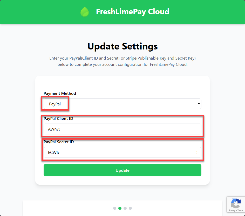 Go to your PayPal settings page: https://cloud.freshlimepay.com/get-started/update-settings