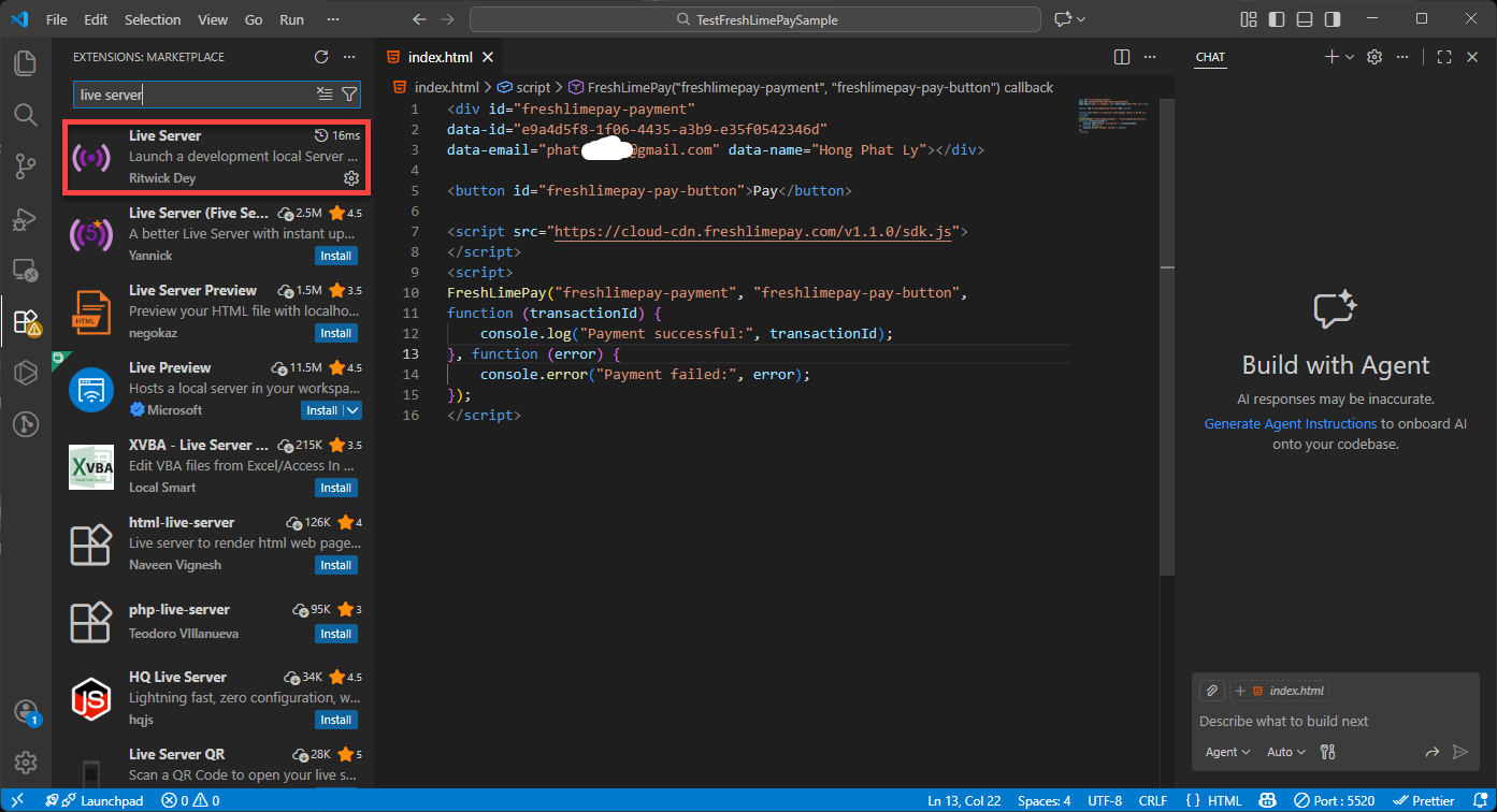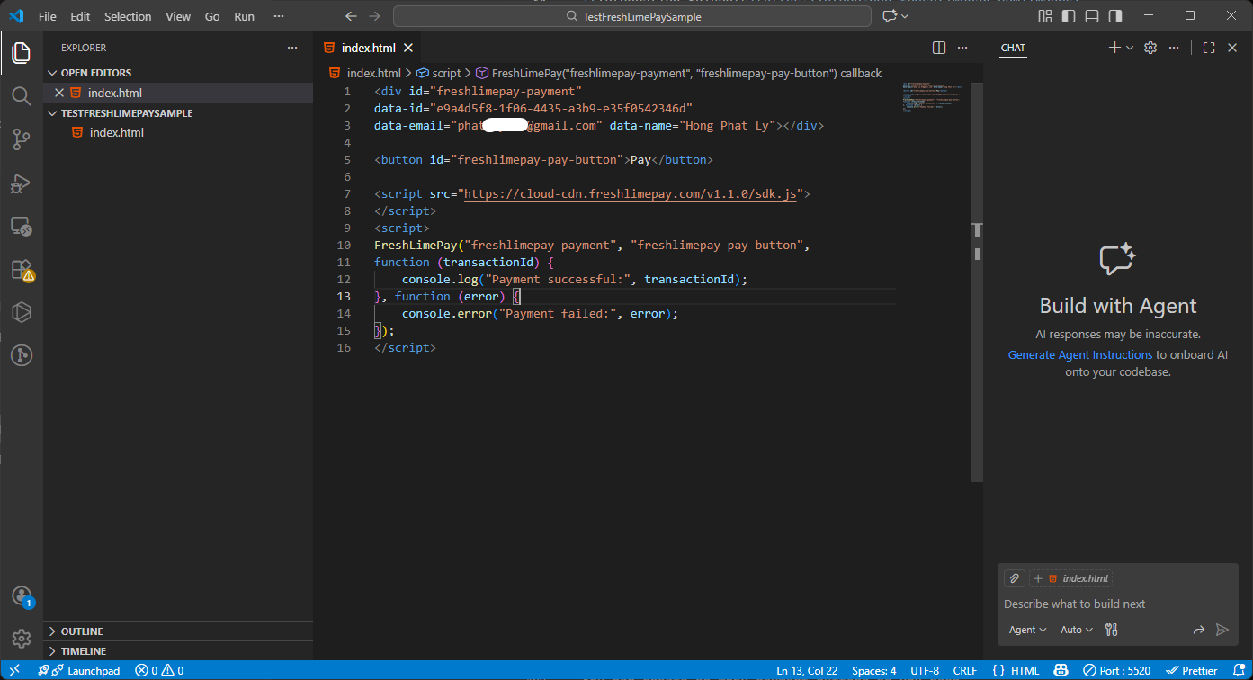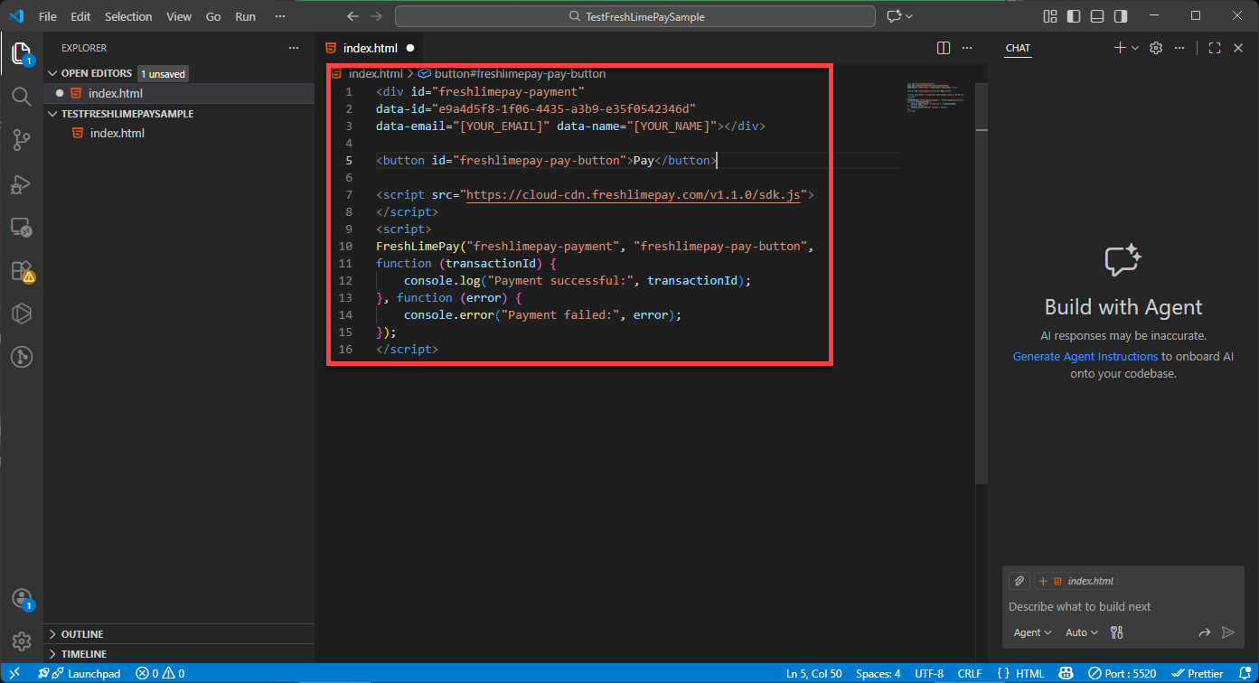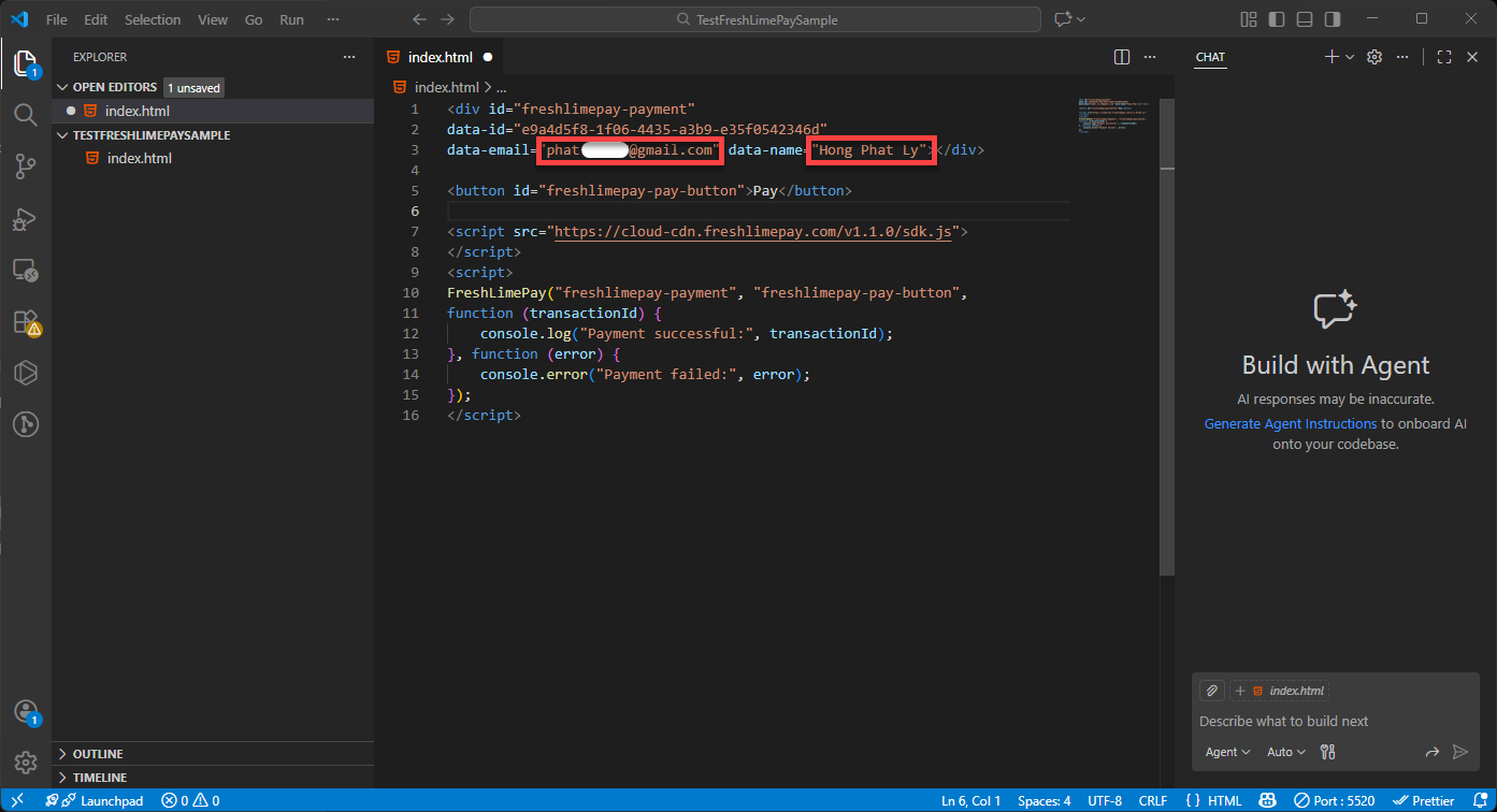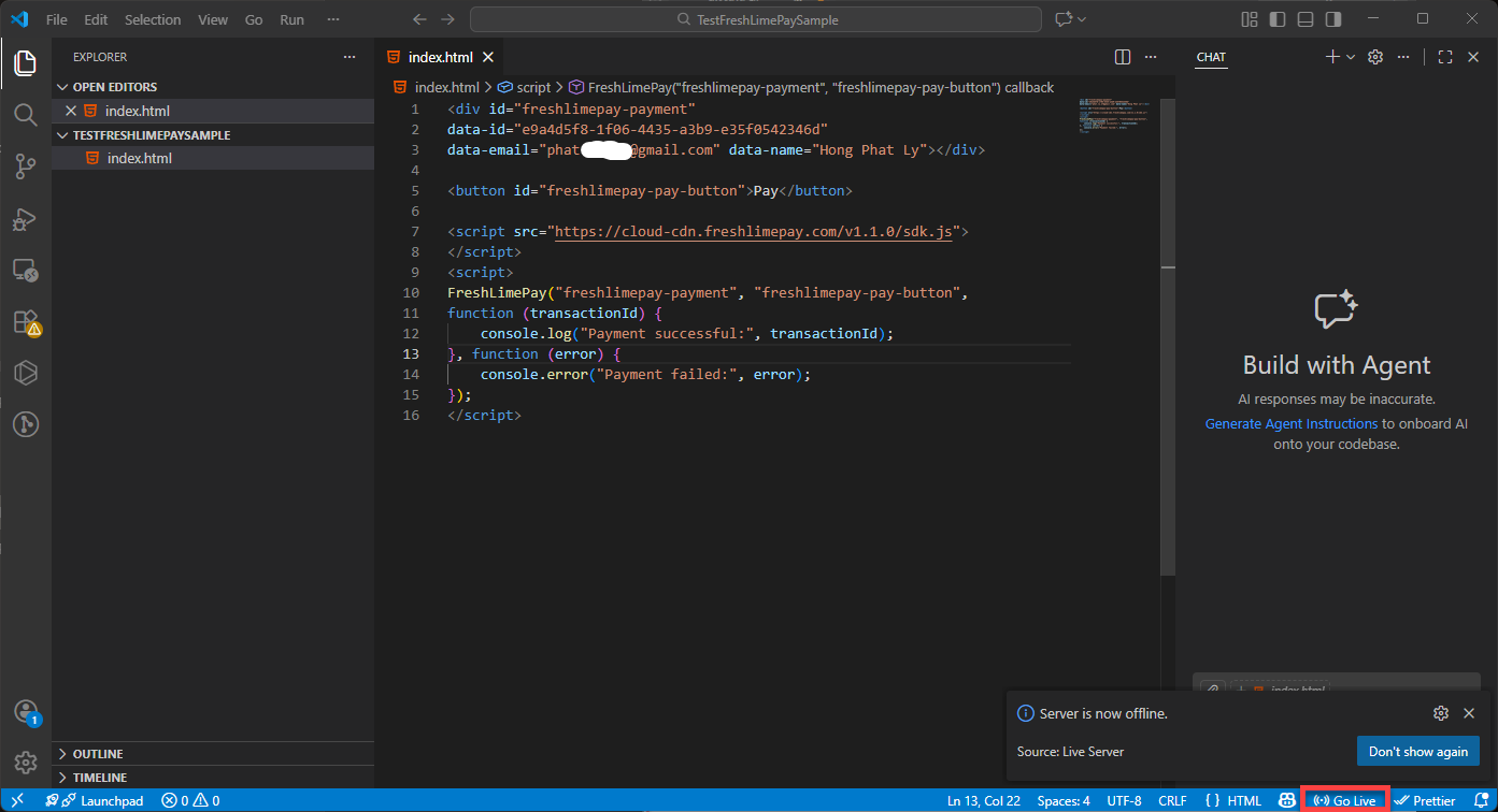 Copy the HTML snippet provided in the product settings: Integration Snippets Paste it into index.html in Visual Studio Code: Paste Snippets Replace “[YOUR_NAME]” into your name and “[YOUR_EMAIL]” into your email in index.html: Replace your name and email Press Ctrl + S to save: Saved Snippets Ensure the Live Server extension is installed: Install Live Server Click Go Live to launch your page: Go Live You’ll then see the integration running in your browser: Integration Result