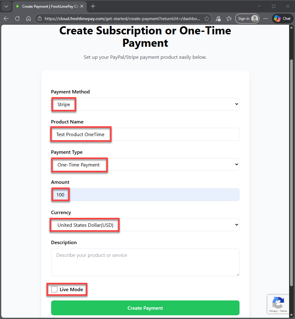 Since the product was created in the Sandbox environment, you can use one of credit cards here to test Stripe payment: Test Payment As shown throughout this guide, you can integrate Stripe payments into your website within minutes using FreshLimePay Cloud — no Stripe expertise required.
